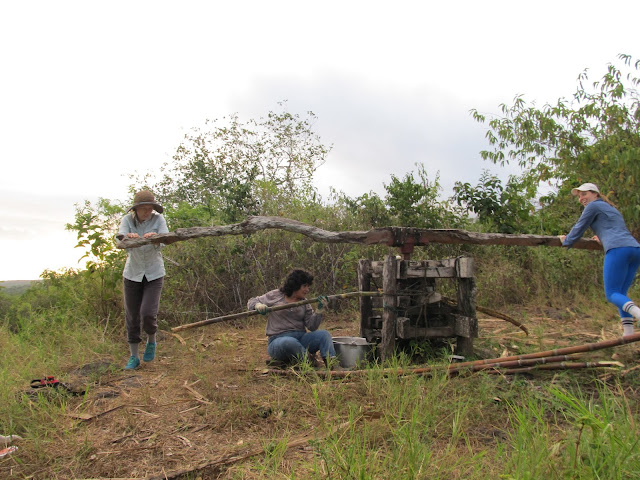 Milton Aguas’ eco-farm on San Cristobal, La Finca de Guadalupe, is a final example of inspiration from our island-hopping food tour. We traveled with Milton and his wife Norma to their farm. It was a bumpy ride down unpaved and washed-out roads.We braved the bugs of the jungle to hike to their waterfall-shower and sweated through the process of pressing sugar canes into juice by hand. We made dinner of freshly harvested coconut milk and herbs over fish with rice and fried plantains. Afterwards, we processed coffee beans and made passion fruit juice until past midnight. “Fresh fruit doesn’t wait,” Norma reminded us.